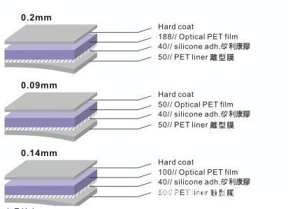 4、PET離型膜、PET基材和PET保護(hù)膜基材均為透光率達(dá)到95%以上的聚酯薄膜。
